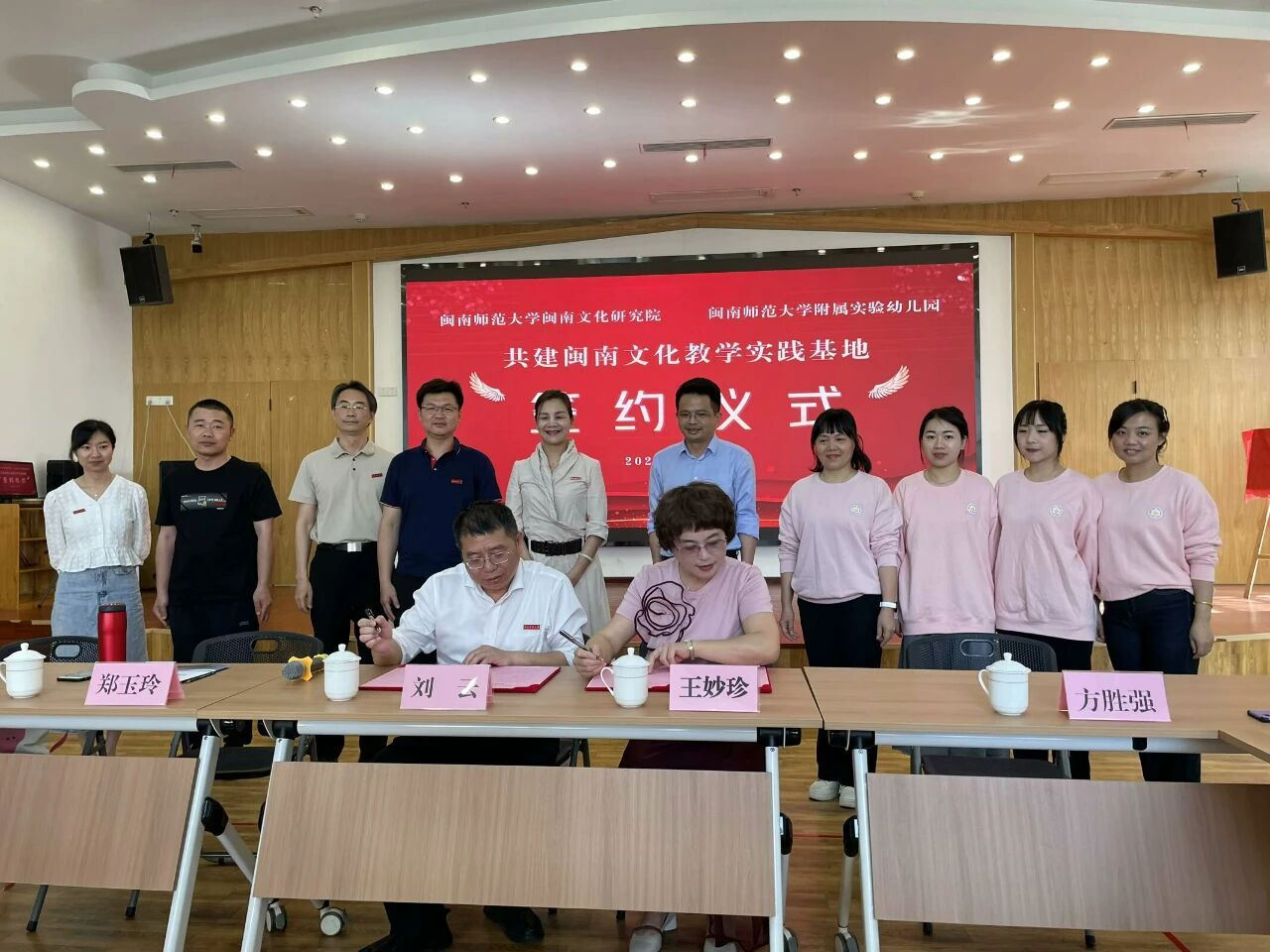 闽南文化研究院刘云院长与附属实验幼儿园王妙珍园长共同在共建协议书上签字,并交换签约协议书。