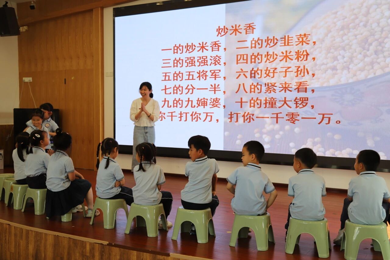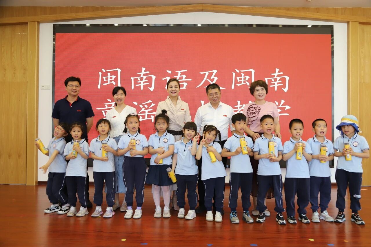 闽南文化研究院青年教师许霖博士为幼儿园大班小朋友们进行闽南语及闽南童谣现场教学,教他们学说闽南话,唱《炒米香》《天黑黑》等闽南童谣。